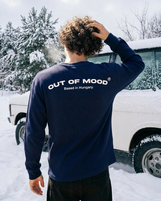 Person wearing a white OUT OF MOOD SIMPL crewneck with a logo on a plain background. Famous hungarian streetwear brand.
